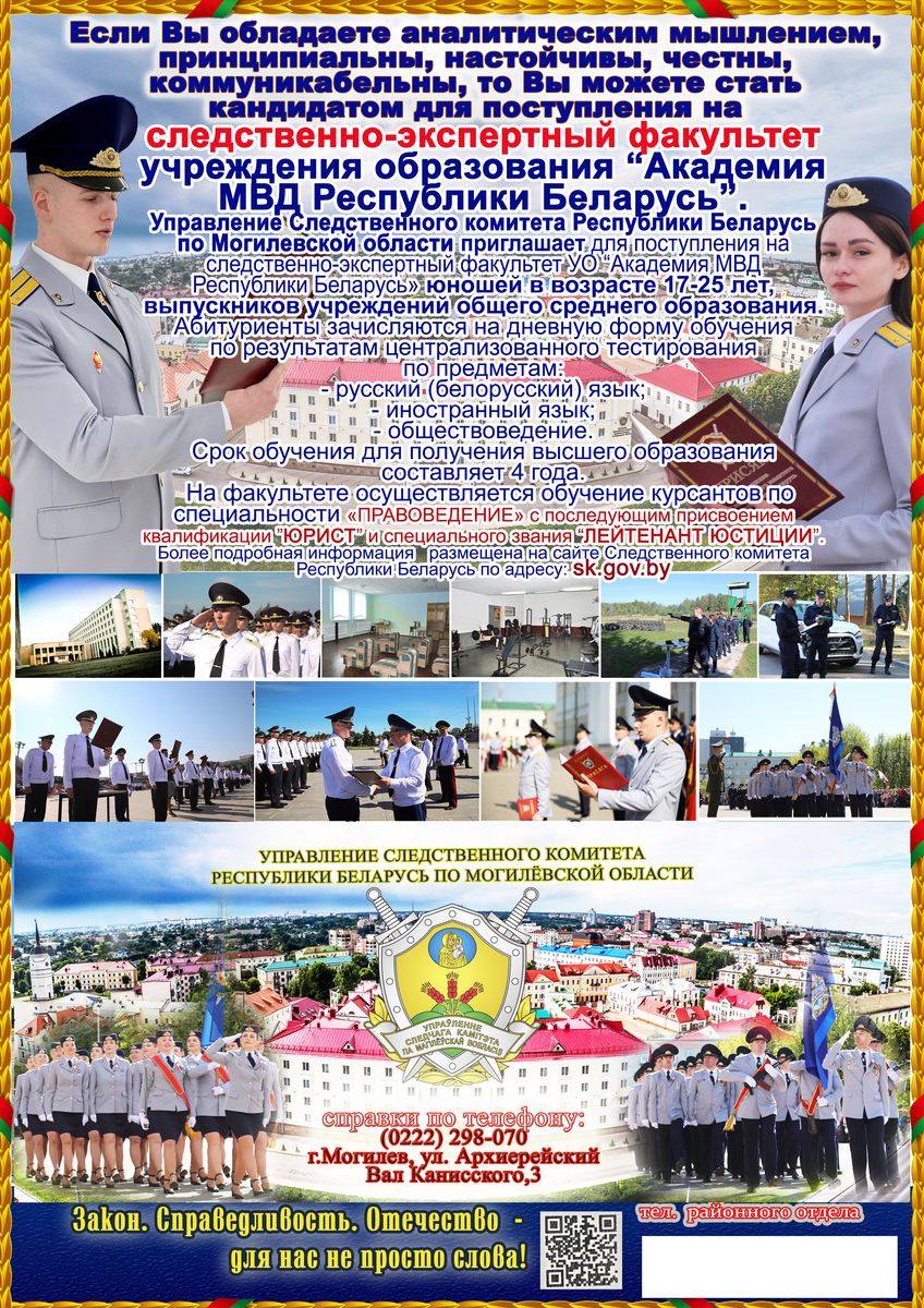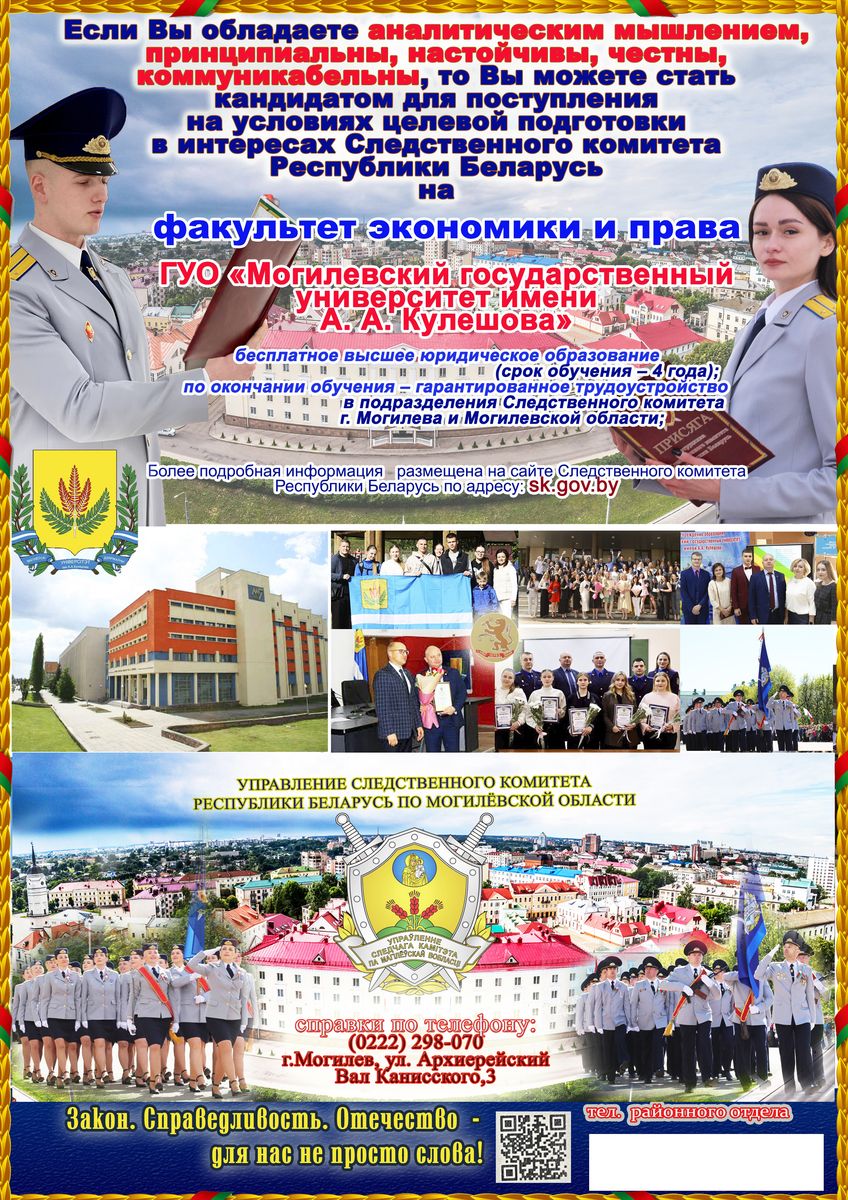 ü по окончании обучения — присвоение квалификации «юрист» и специального звания «лейтенант юстиции», гарантированное трудоустройство на должности среднего начальствующего состава в подразделения Следственного комитета г. Могилева и Могилевской области;
